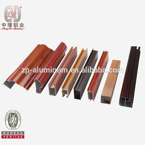 custom door and window aluminum extrusion Specification:  ZP ALUMINUM Grade and Temper 6063 6061 6060 T5 (T6)  7000 series Thickness 0.4--50m Cross-section 8--650mm Surface Treatment Anodizing,Powder Coating,Wood Grain,Electrophoreses, Mill finish,polisehed and brushed  Advantages 1.Good quality in material; 2. Excellent surface finish 3. Competitive price Standard GB/75237-2004,Q/320281/PDWD-2008 Certificate  1) ISO9001-2008/ISO 9001:2008; 2) CQM Certification; 3) SGS, CE, BV, JIS, AS, available Guarantee Surface color can be stable for 10~20 years indoor using. Settlement Terms Charge by final actual weight or by drawing theoretical weight        Color: Anodizing: Silver, bronze, champagne, titanium, nickel, golden yellow, etc. Anodizing thickness is up to 25um. PVDF Coating: White, black, bronze, grey, green, Powder coating thickness is more than 60um. Wood Grain 1. Italian MENPHIS transfer printing paper. 2. AKZO NOBEL INTERPON D10: Australia ceder, Bush cherry,Chest nut, Jarrah I, Jarrah II, Western red ceder, etc. 3. AKZO NOBEL INTERPON D34: Bush wood, Western red,Jarrah, Snow gum,etc. Electrophoresis:  Silver, nickel, golden yellow, black, champagne, etc Polishing  Silver, nickel, golden yellow, black, etc Brushing:...