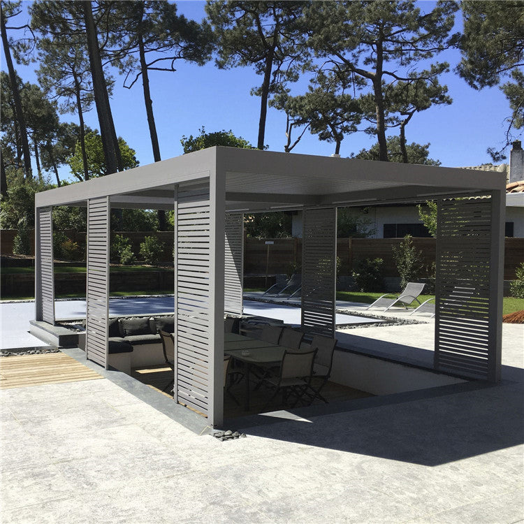 Type:Arches, Arbours, Pergolas & Bridge Place of Origin:Guangdong, China Metal Type:Aluminum Feature:Easily Assembled, ECO FRIENDLY, Renewable Sources, Waterproof Material:Extruded Aluminum Alloy (6063-T5) Color:grey, white, black or customized Size:grey, white, black or customized Surface treatment:powder coated Warranty:10 years Operation:Motorized (remote Control) Sensor system available:Rain Wind Sensor Application:Dining/Bar/Relaxation/Swimming pool etc. Wind load...